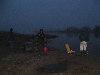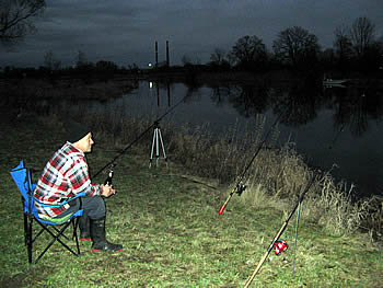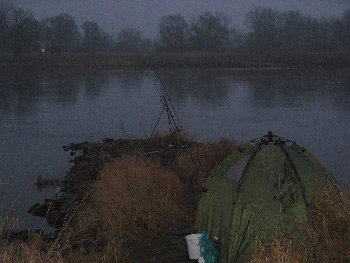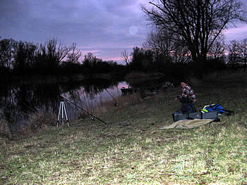 Hier sitzt, wie oft in diesen Tagen, der Fischer selbst auf Quappen an. Diese herrliche Angelstelle befindet sich direkt am Fischereihof, nur ca. 100m von der Unterkunft und dem Parkplatz entfernt. An dieser Stelle wurden von den ersten Quappenanglern schon eine Quappe von 76cm, eine von 73cm und in der letzten Woche 2 knapp über 40cm und zahlreiche kleine gefangen. Die Großen sind zwar da, was der Fischer in seinen Quappenfallen merkt, aber so recht beißen die "Erwachsenen" noch nicht. Am Donnerstagabend hatten wir z.B. zwar jede Menge Bisse (waren aber wohl auch noch einige Plötzen zugange), holten aber nur Miniquappen heraus. Da es in den nächsten Tagen wesentlich kälter werden soll, bekommen hoffentlich auch endlich die Großen richtig Appetit.